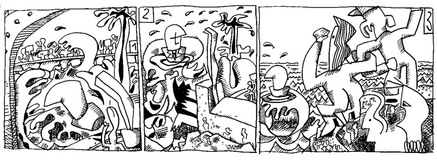 | (76 / 92) Attentat oder Versehen?! Der Ober stürzt kopfüber in die Flut. Eine Springflut erfasst ihn und trägt ihn durch das zerborstene Schleusentor auf das Meer hinaus.12 Stunden vergehen. Was ist das! Da staunen Litta und alle anderen, die mit ihr auf dem Wandervulkan reisen, als sie der Ober auf einer Welle überholt. |