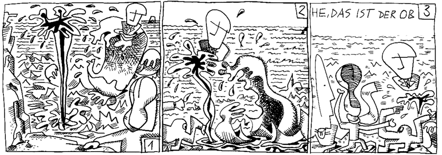 | (77 / 92) Der Ober kommt lange vor dem Wandervulkan an. Die Springflut stolper über die Bodenwelle, die unter dem Wasser liegt, und verliert ihre wertvolle Last an die Fontaine, die mittlerweile wieder im Steigen begriffen ist. Sie übernimmt den Ober und wirft ihn auf die Klippe. Herr Oberbürgermeister! Sie hier? |