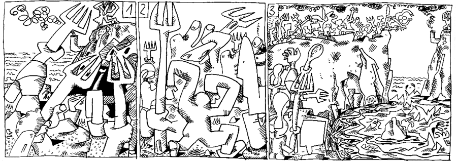 | (81 / 92) Litta traut ihren Augen nicht. Auf der gegenüberliegenden Klippe des Monte Kaoh scheinen Schwerbewaffnete auf sie zu warten. Sie drängen nach vorne, klettern über die Kante und beginnen in wilder Hast aus dem Besteck eine Brücke zusammenzustecken. Litta reibt sich die Augen. Da ist ja auch mein Bruder, der Bildhauer! |