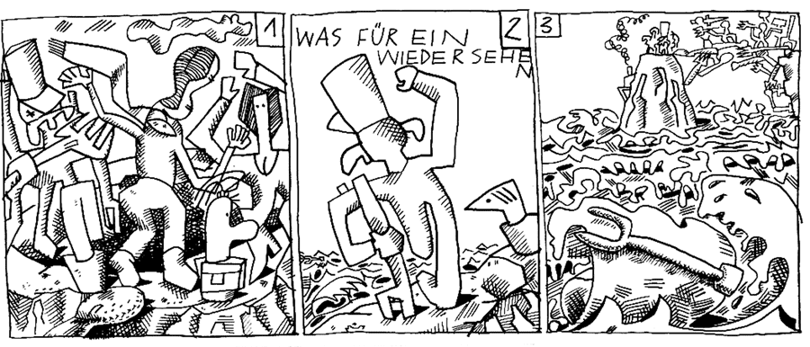 | (85 / 92) Messer, Gabeln, Scheren und auch Löffel verschwinden im Vulkan. Auf dem Rand herrscht großes Gedränge. Als Lehmgets Blick zufällig über das wildbwegte Meer streicht, durchfährt ihn ein Wiedererkennen. Ist das, was da draußen auf einer Welle treibt, nicht seine alte Krücke, die bei Woo-Fis Suchaktion verlorengegangen war! Sie ist es! |