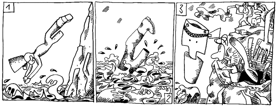 | (86 / 92) Kurzentschlossen stürzt sich Kapitän Lehmget Walter mit einem Hechtsprung in die Tiefe, um zu seiner Krücke zu schwimmen. Mann über Bord! Wies, der wie der Steuermann von Lehmget Walter aussieht, aber der Chauffeur von Mies, dem Architekten ist, springt spontan hinterher. |