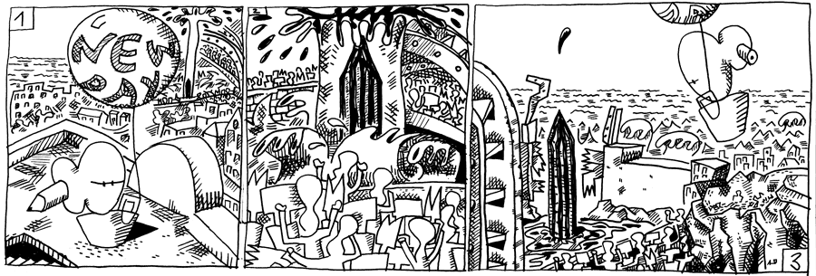 | (91 / 92) Auf dem Dach vom Verlagsgebäude bricht German mit dem Dienstfahrzeug auf. Er ist Augenzeuge von etwas Unfassbarem. Das Wasser der Fontaine versiegt. An ihrer Stelle dringt ein kirchturmhoher Nagel aus dem Erdinneren hervor. Everywen hat ein neues Wahrzeichen. Was ist geschehen? Wir berichten. German steuert seinen Ballon auf den Horizont zu. Unter ihm schwappt die Ostsee. |