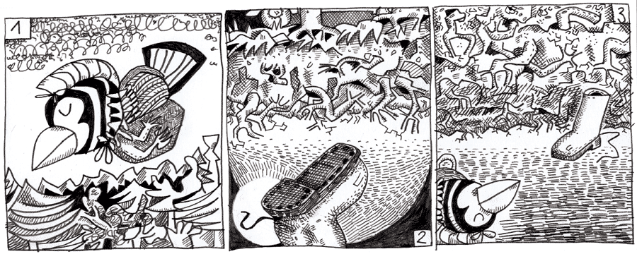 (107 / 281) Wenn wir uns erneut der Schwamsel zuwenden, können wir feststellen, daß sich die Schwerkraftverhältnisse auf dem schwebenden Waldstück gewandelt haben. Jetzt besitzt der schwebende Wald einen eigenen Orbit. Auch unter dem Wald kann man nicht mehr runterfallen. Die Schwerkraft ist insgesamt allerdings nicht mehr so stark wie vorher. Das bekommt man in höheren Lagen zu spüren. Die Schwamsel z.B. treibt ab, ohne das im Schlaf zu merken. Ihre Umlaufbahn kreuzt die Umlaufbahn von Relis rechtem Stiefel. Beim Stiefel ist eine Naht aufgegangen. |