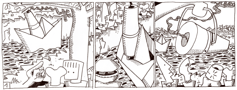 (140 / 281) Seht mal! Da! Die Everywener sind schon auf dem Rückweg. Was macht denn der alte Strie hier? Dass er hier halb Everywen finden würde, hat Herr Strie seinerseits auch nicht erwartet. Sein erster Eindruck ist, daß man über sein Auftauchen alles andere als erfreut ist. Aber der Eindruck trügt. Das wird vor allem in der wortlosen Freundlichkeit deutlich, mit der Van der Aimers Arm Herrn Strie aus dem Wasser hebt. Was in der Entfernung nach mürrischen Gesichtern aussah, ist aus der Nähe betrachtet Ausdruck großer Müdigkeit. Alles gähnt. Das waren zuviele Abenteuer auf einmal. Außerdem war die Nacht, wie wir wissen, keine richtige Nacht. Der Strär freut sich auf die Unterhaltung mit Herrn Strie. |
