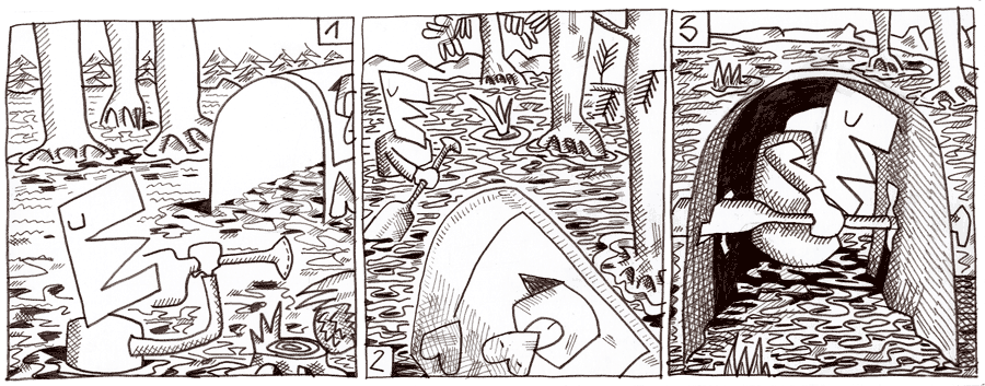(148 / 281) Szenenwechsel. Wir befinden uns im schwebenden Wald. Seltsam, jetzt scheint das Wasser in die entgegengesetzte Richtung zu fließen. An die Stelle des Wasser- Stiefel-Kreislaufes scheint eine Wechselströmung getreten zu sein. Mal fliesst der Fluss in die eine, dann wieder in die andere Richtung. By-Pass wird aus dem schwebenden Wald Teil 1 hinausgetragen. Bald ist er auf dem Verbindungsstück zum Teil 2. Dazwischen liegt die Stelle, wo die Kids Relis Herzdame zurückgelassen haben. Sie wölbt sich und bildet mitten in der Fahrtrinne eine Röhre. Ahnungslos, daß es wieder enger wird, paddelt Bypass mit großen Schwüngen. Plötzlich Widerstand. Das Paddel verhakt sich in den Löchern, in denen Relis Hirtenstab gesteckt hatte. Als die Schwamsel zwischen den Bäumen hängengeblieben war, waren die Löcher größer geworden. Der Widerstand gibt nach und By-Pass kommt weiter, ohne das Paddel bewegen zu müssen. |
