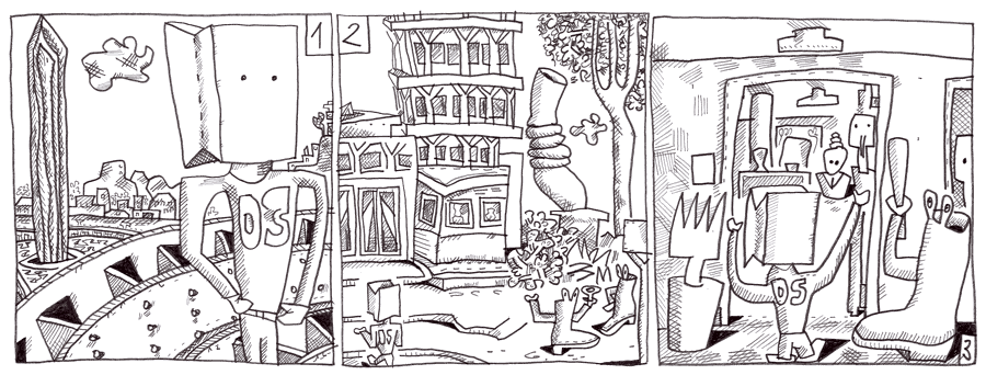 (151 / 281) Omar Sheriff auf einem seiner Lieblingsplätze. Von der Brücke aus hat er eine gute Aussicht. Hier bekommt er sein Gefühl für das Ganze zurück. Und das kann er gebrauchen. In seiner Geschichte ist so verwirrend viel geschehen, daß er nicht mehr weiß, ob das überhaupt noch seine Geschichte ist. Hat er überhaupt noch Einfluß auf ihren Fortgang ? Jana Waid, die Direktorin vom Al Kreuch Gymnasium hat ihn angerufen. Sie hat dieselben Fragen wie er. Weiß man, was als nächstes kommt? Was ist letzte Nacht geschehen? Was können Sie mir dazu sagen? Weil Omar Sheriff eine Tüte über dem Kopf hat, können wir nicht in seinem Mienenspiel lesen. Ist er wirklich überfragt? Am Al Kreuch Gymnasium herrscht große Aufregung. Die Staatsstiefel führen eine Untersuchung durch. Außerdem soll in einer halben Stunde der Ältern-Sprechtag beginnen. Die Ältern erwarten Auskunft über die Ungereimtheiten am Al Kreuch Gymnasium, speziell über das Verschwinden einiger Kinder und Ältern. |