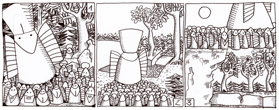 (167 / 281) Hier könnt Ihr zum ersten Mal sehen, liebe Kinder, wie die himmlischen Heerscharen The Pubst transportieren. Sie nähern sich der Paradies-Kante. Dort betreten sie den Luftweg. Im Gegensatz zum schwebenden Wald, auf dem alle noch schlafen, brennt hier die Sonne vom Himmel herab. Der Pubst braucht einen Baldachin. Das war doch auch Euer Gedanke?! Und noch eins wollt Ihr sicher wissen. Wie schwer ist der Pubst eigentlich? Reichen die Engel, um ihn zu tragen? |