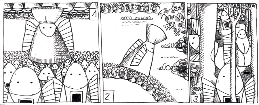 (170 / 281) Die Engel in der vordersten Reihe haben sich ganz auf die Vorsehung ihres Oberhauptes verlassen. Sie reissen vor Entsetzen Münder und Augen auf. Zu spät! Bremsen unmöglich! Der Unterbau kann gerade noch abtauchen. In voller Geschwindkeit jagt er durch das Wurzelwerk des Schwebenden Waldes. Die Sichtweite ist stark eingeschränkt. Den Schwebende Wald hüllt die Nacht ein. Für die Baldachin-Engel im Oberbau gibt es auch kein Ausweichen mehr. Sie brettern in den Wald. Schreien und Wehklagen erfüllt die Luft. Ja, da staunt Ihr! Auch Engel finden es nicht schön, wenn sie vom Weg abkommen. Wo sind wir? |