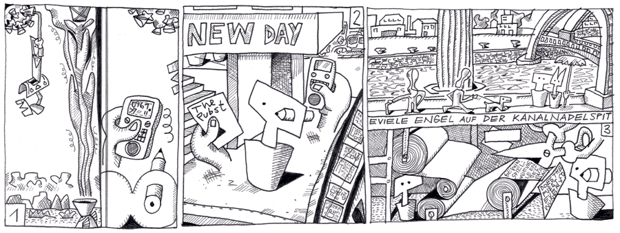 (172 / 281) Ihr sehr, wie Air-Man unter der oberen Bildkante verschwindet. Dabei wird der Blick auf die Wander-Wunder-Wolke wieder frei. Der Reli hakt stetig nach. Dadurch geht es aufwärts. Zusätzlich erfassen ihn die Ausläufer der Heiß-Luft-Bewegung. Air-Man bleibt ruhig. Mitten im Durcheinander behält er den Überblick. Er benachrichtigt mit seinem Handy die Redaktion an. Der Print-Pröppel wollte gerade seine Mittags-Pause machen. Air-Man gibt ihm alles durch und kündigt an, daß er in Windeseile mit den Bildern eintrifft. Er will noch vor der Wander-Wunder-Wolke in Everywen sein. „ The-Pubst-Besuch und das „Wunder von Vierzehn Halben“ sind Jahrhundert-Ereignisse. Wir berichten exklusiv! “ schreit er ins Telefon. Die Everywener sind ahnungslos. Sie wissen nicht, was auf sie zukommt, und gehen in der Sonne spazieren. Der Print-Pröppel bereitet das ND-Extra-Blatt vor. Es gibt auch ein Gewinn-Spiel. „Wieviele Engel passen auf die Kanal-Nagel-Spitze?“ lautet die Frage. |
