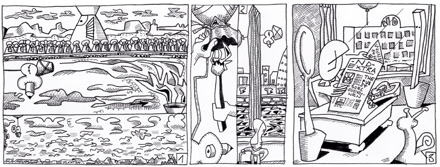 (173 / 281) Wo sind die Baldachin-Engel? The Pubst kann nicht warten. Die Wander-Wunder-Wolke, die eine Fälschung sein könnte, ist auf dem besten Weg, ungeprüft in die Welt zu gelangen. Hoffentlich bleibt der Schienenweg heil . Die Engel erhöhen das Tempo. Sie müssen die Länge des Weges durch Geschwindigkeit ausgleichen. Jetzt heißt es, schneller als das Licht! Die heiße Luft befördert Air-Man in die obersten Schichten der Atmosphäre. Die Luftströmungen dort haben ein rasantes Tempo. Wo bleibt die Wander-Wolke? Auch der Reli hat durch stetiges Nachhaken raschen Luft-Strömungen erreichen. Air-Man kann im Gegensatz zu The Pubst den Luftweg nach Every-Wen nehmen, aber er muß sich beeilen. Ach, dafür sind die Streichhölzer da! So lässt sich die Luft im Ballon erhitzen. Das ist wohl der Nachbrennffekt? Überflüssige Frage! Das Extrablatt ist fertig! An allen Strassenecken wird es ausgerufen. Der OB lässt sich eines besorgen. „Warum muß ich das aus der Zeitung erfahren?“ brüllt er. „Hören Sie sich das mal an: „14 Halbe. Das Wunder von Everywen. The Pubst kommt.“ Und wir wissen nichts davon!“ |