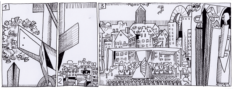 (187 / 281) Ihr habt wahrscheinlich sofort erkannt, dass das unbekannte Flugobjekt nur Reli sein kann. Gleich nachdem By-Pass weggegangen war, hat Reli seine Spielkarte wieder zu einem Flugzeug umgebaut. Er will endlich nach Hause. Erinnert Ihr Euch an den Anfang der Geschichte! Aber ihm ergeht es wie der Wunder-Wander-Wolke, er kann sich auch nicht der magnetischen Kraft des Kanalnagels entziehen. The Pubst bricht auf. Die Prozession macht sich auf den Weg. Ursprünglich hat The Pubst das Wunder von Vierzehn Halben auf seine Echtheit hin überprüfen wollen. Mittlerweile scheinen sich die Wunder zu überschlagen. Sind sie vielleicht nur Teile eines wundervollen Vorgangs, sollte man erst dessen Ende abwarten ? Eine Prozession braucht ihre Zeit. Armer Reli! Jetzt hat sich sein Hirtenstab an der Nagelspitze verhakt. Nur gut, daß er schlank und leicht ist! |