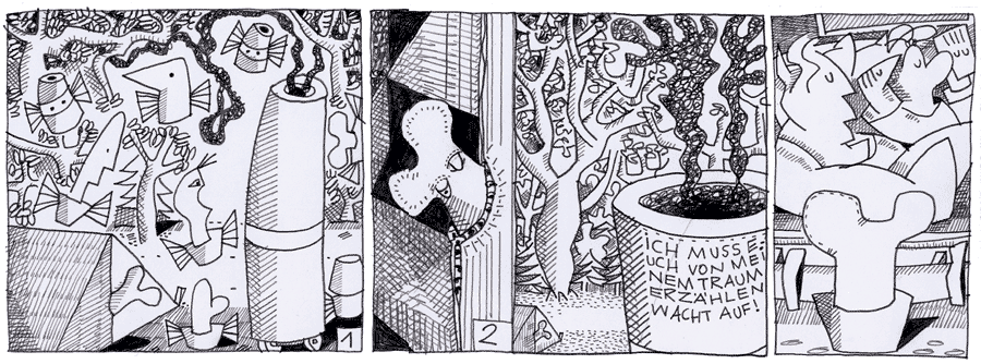 (191 / 281) Die geflügelten Wesen tollen herum. Offensichtlich amüsieren sie sich. Herr Strie schläft und scheint von all dem nichts mitzubekommen. Das harzige Holz, das er verbrennt, riecht wie Weihrauch und verbreitet eine Atmosphäre feierlicher Geborgenheit. Fo schließt kurz die Augen. Als er sie wieder öffnet, ist der Spuk vorbei. Der Lagerplatz leer. Was mag das gewesen sein ? Er muß jemanden fragen. Er läuft zum Bus, in dem die Lückenknüllerkids mit Liberty und ihre Ältern ruhen. Wacht auf! Ich muß Euch einen Traum erzählen! |