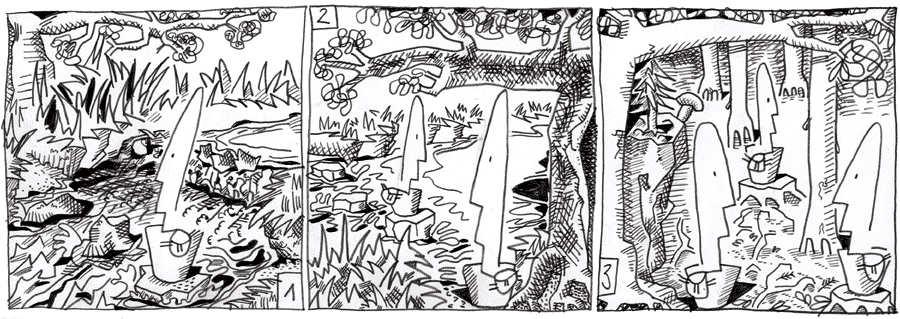 (202 / 281) Woo-Fi entschließt sich, seinen Weg auf den Trittsteinen fortzusetzen. Gleich hat er das andere Flußufer erreicht. Wie geschieht mir? Träume ich, oder bin ich schon drüben? Im Schatten des Baumes steht eine Gestalt, die er selber sein muß. Er springt vom dritten Stein aus ans Ufer. Er ist es. Wie ist soetwas möglich? Was soll das Fragen, der ganze Wald ist voller Woo-Fis! Und alles schweigt. Der Wald, die Bäume, die Woo-Fis. Nur der Fluß plätschert und strudelt und gurgelt weiter. Das kann nicht wahrsein. Hat Woo-Fi nicht richtig hingesehen? Wisst Ihr, was Woo-Fi bei der hundertprozentigen Ähnlichkeit übersieht, die die Waldgestalten mit ihm haben? |