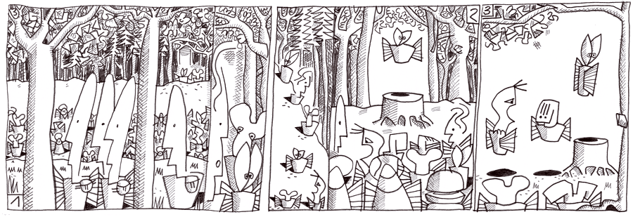 (210 / 281) In der Mulde unter ihnen sind unzählige Engel versammelt. Die meisten sehen wie verkleinerte Everywener aus. Auf der anderen Seite sehen sie Woo-Fi in Begleitung mehrerer Ebenbilder herankommen. „Was jetzt?“, frägt man Hier-soll-es-schön-sein, der der Älteste ist. „Das sehen wir uns aus der Nähe an!“, meint er. Sie klettern den Abhang hinunter und mischen sich unter Millionen von Engel. Sie verlieren einander nicht aus den Augen, weil sie die Engel wenigstens um eine Kopflänge überragen. Warum zieht Xe die Aufmerksamkeit aller auf sich. Zweimal dürft Ihr raten! Er hat die Flugangst überwunden, die alle anderen Engel immer noch fesselt. Er landet auf einem Baumstumpf. Zuerst zeigt er ihnen, wie man startet. Macht es nach! Einige trauen sich. |