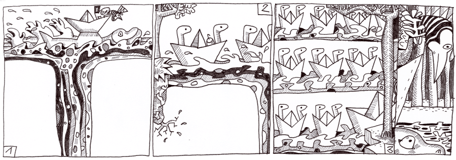 (216 / 281) Und so geschieht es. Die Schwamsel und der Lachs schwimmen voraus. Die Regenwürmer folgen. Gut, daß die Schwamsel soviele Bötchen gefaltet hat. Es sind viele Regenwürmer, die mitwollen, um das neue Land zu bestellen. Schon haben sie die Leichtwasser-Brücke überquert und erreichen das Land, das im schwebenden Wald Teil II liegt. |
