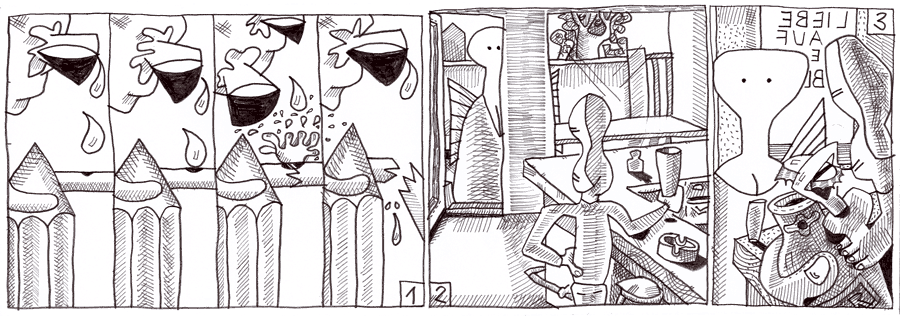 (219 / 281) Noch dehnt sich der Augenblick. Dann ist er doch zu Ende. Der Tropfen fällt. Sein Gewicht gibt den Ausschlag. Er fällt auf den überlasteten Hirtenstab, an den sich Reli klammert. Knacks. Er bricht. Die Zeitlupe zeigt, wie sich die Bruchstelle vergrößert. Für Reli gibt es kein Zurück. Auch für The Pubst-Inn gibt es kein Zurück mehr. Der Durst zwingt sie, Ros Kneipen-Türe zu öffnen. Ro hat zwar noch nicht geöffnet, aber es ist nicht seine Art, jemanden, der Durst hat und ausruhen möchte, abzuweisen. The Pubst-Inn überrascht soviel Freundlichkeit. Sie ist überwältigt. Ja mehr noch. Das muß Liebe auf den ersten Blick sein. Ohne daß sie ein Wort gewechselt haben, wissen beide, daß es der andere weiß. Ro öffnet ein Bier. Er ist geblendet von der Gewißheit, die ihm der Anblick der Eintretenden gibt. „So sieht ein Engel aus!“ The Pubst-Inn sagt: „Ich bin Babsy.“ Die Zeit steht still. |